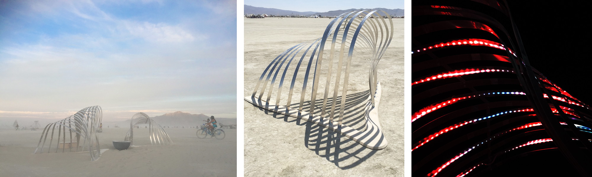 Moire/Moray was a 2015 temporal art installation comprised of 2000 LEDs mounted to a series of twisting aluminum strips. During the day, you could see the desert landscape reflected on its arches; at night, it lit up with psychedelic patterns and fire to warm up desert travelers!