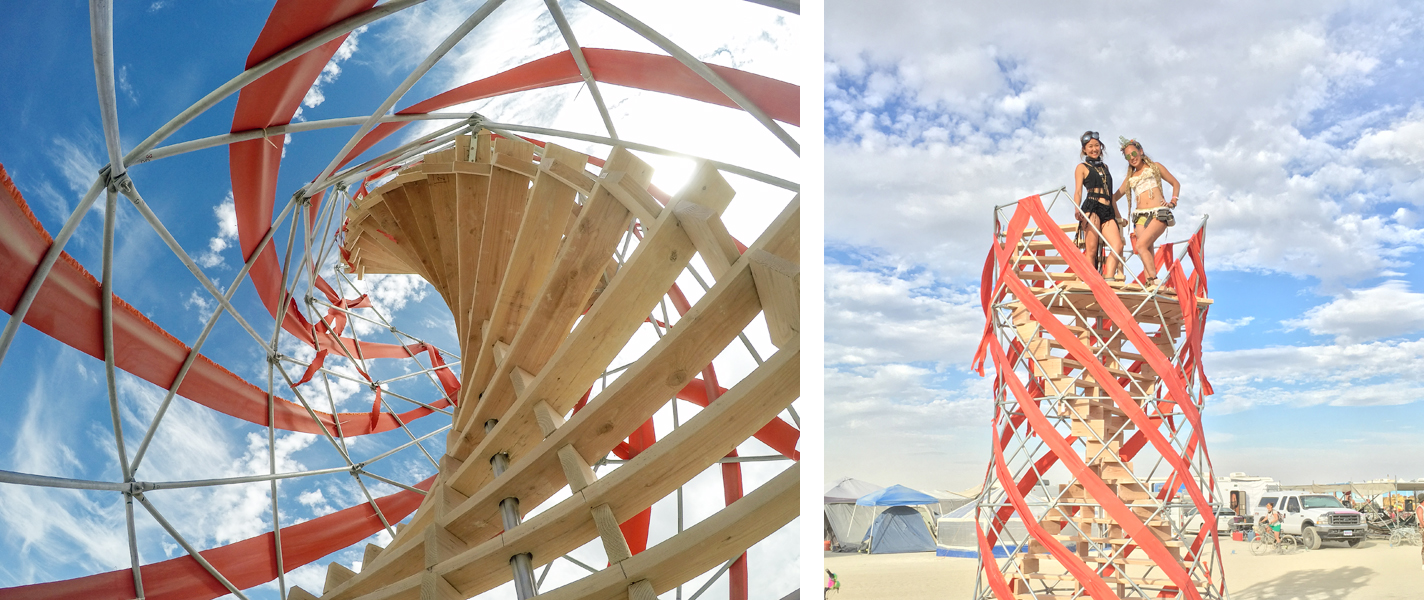 LuxTorr was Camp Spice N Vice's parametric diagrid tower, constructed and exhibitied at Black Rock City in 2016. It was a great place for a group of friends watching the sunset or sunrise together.