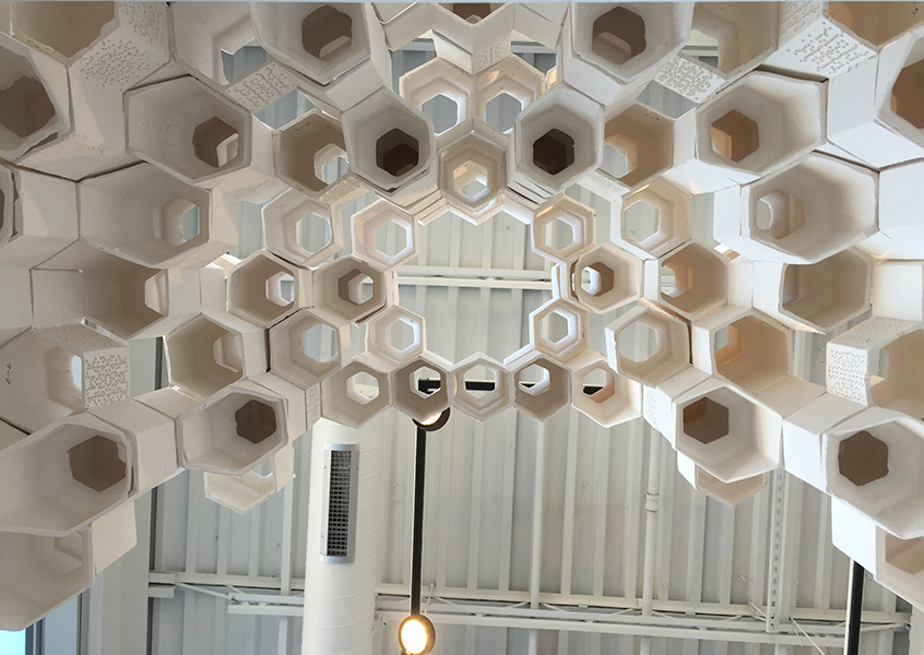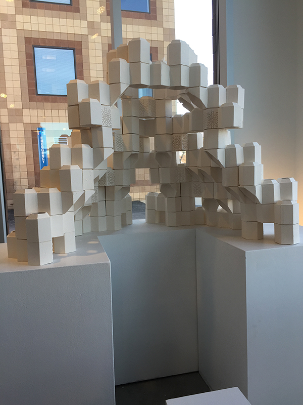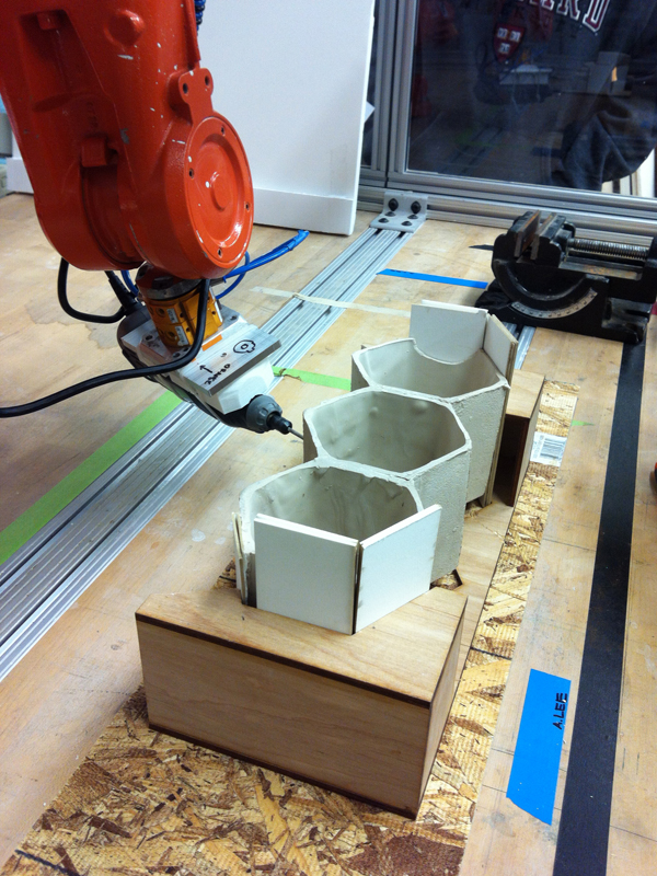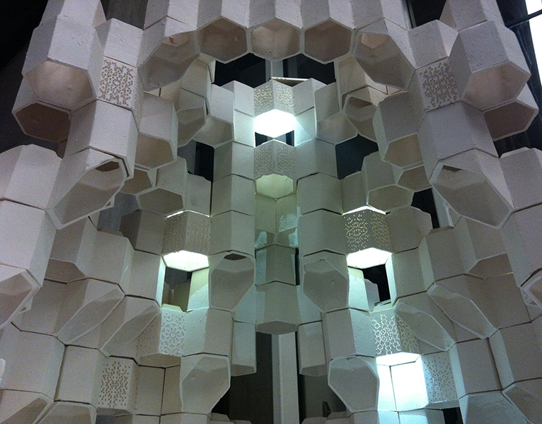 A refabrication of the Islamic muqarnas. Traditionally used as a decorative element connecting the floor and ceiling, this project examines the possibility of the muqarnas as a structural and compressive structure using ceramics. Digital processes were used to create the mold for slip casting, and a 6 axis robot was used to create variations within each brick.