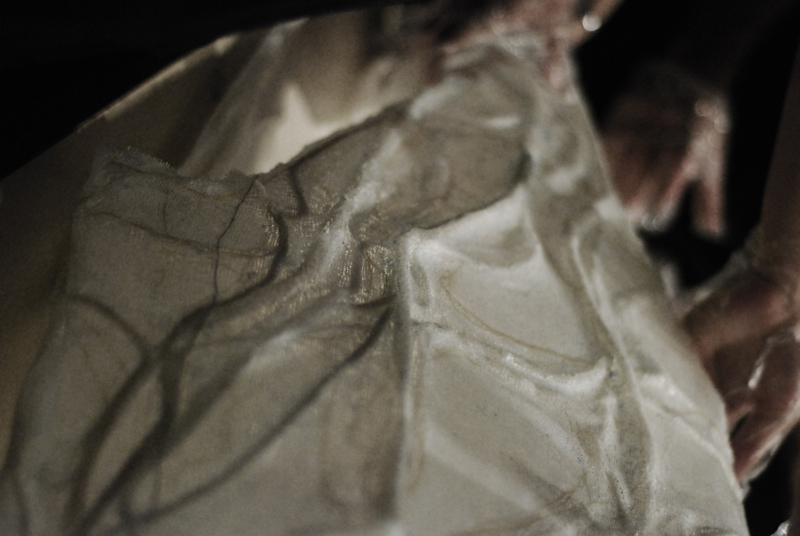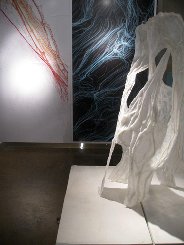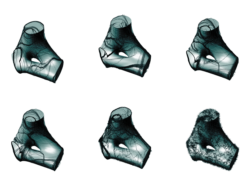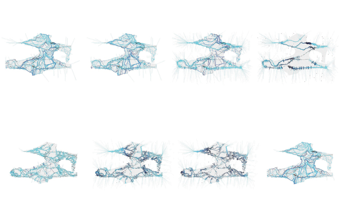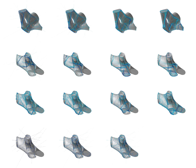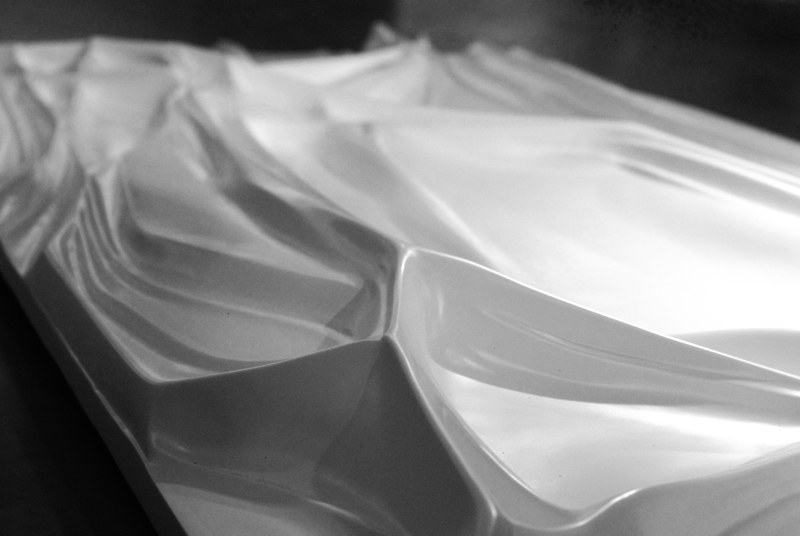 This installation design sought to experiment with materials and methods that combines structure and skin. The design agenda was to develop an understanding of how a single surface can fold and be reinforced with fiber in order to create structural qualities unique to its composite materials. Beginning with the focus of creating structural folds in a flat material to generate concetrnations of structural capacity, I wrote an algorithm using Processing in order to organize folding patterns and densities of material division. The multitude of strands adds strength to the surface structure.