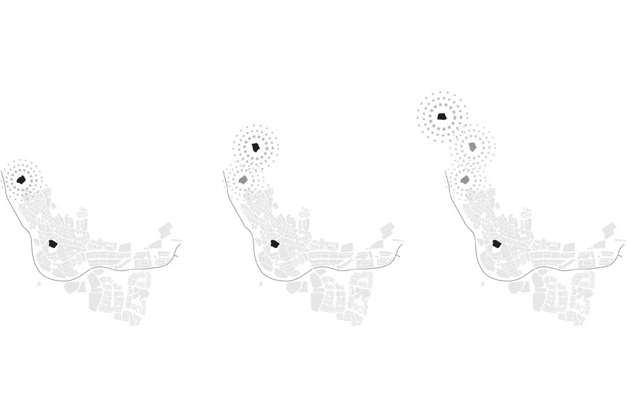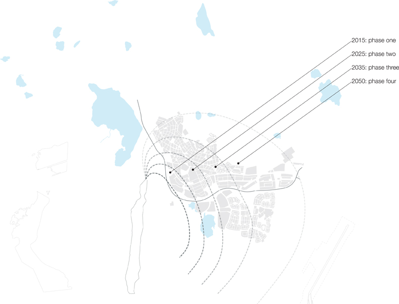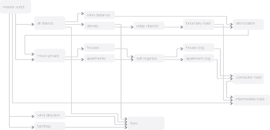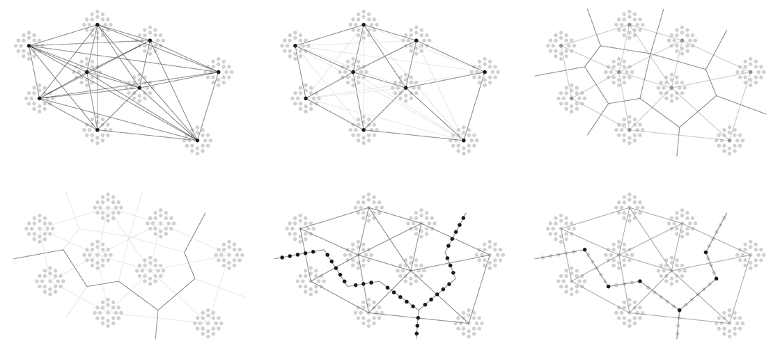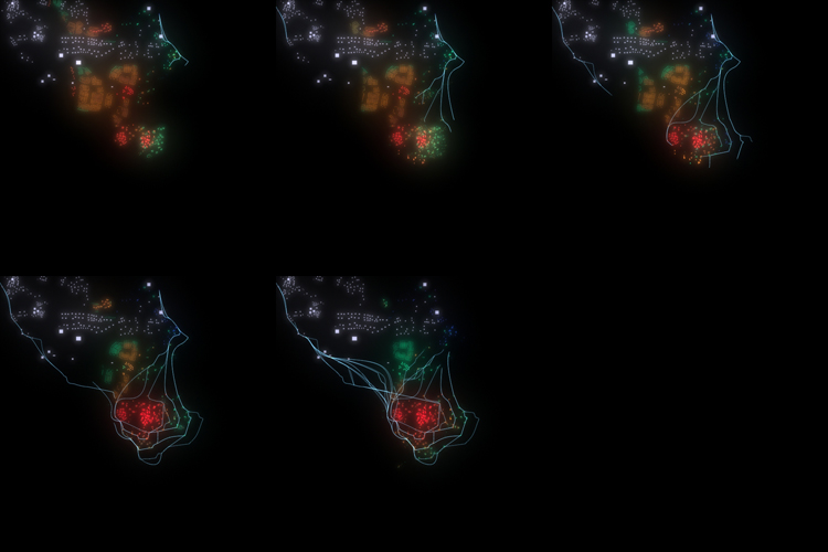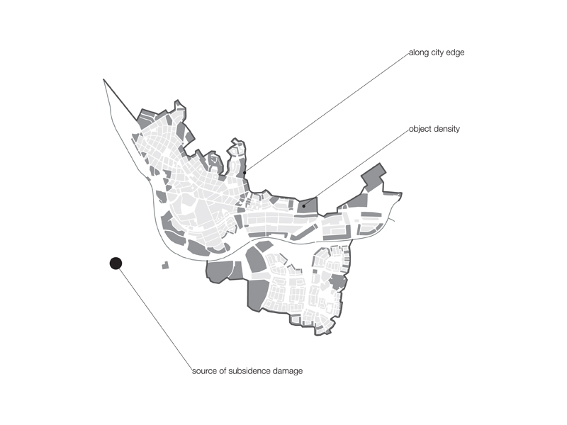 This project seeks to establish a process for gradually shifting the city to firmer ground, while maintaining a constant, critical mass. It is based on a biomimetic study of how penguins huddle in order to survive extreme cold. Just as the penguin huddle is in a state of perpetual mutation as individual penguins peal off from the front to seek sanctuary at the rear, so too here, as individual buildings begin to subside, new buildings are generated on firmer ground to the rear, thereby maintaining a constant critical mass. Individual units coalesce into larger compositions, and roads are then generated to link them.